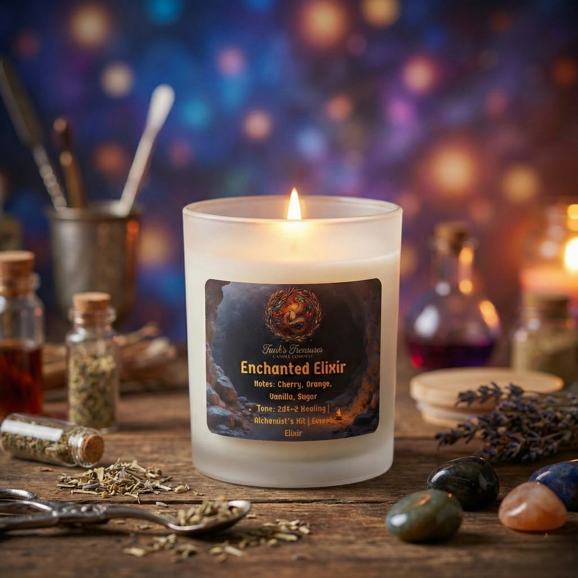 A sip of magic. Glowing softly through the frosted glass, this candle looks like a magical elixir ready to be consumed during a short rest. The bright, cheerful scent bursts with juicy cherry, almond, and zesty orange, mimicking the sweet taste of a healing potion, while a creamy heart of vanilla smooths it out.